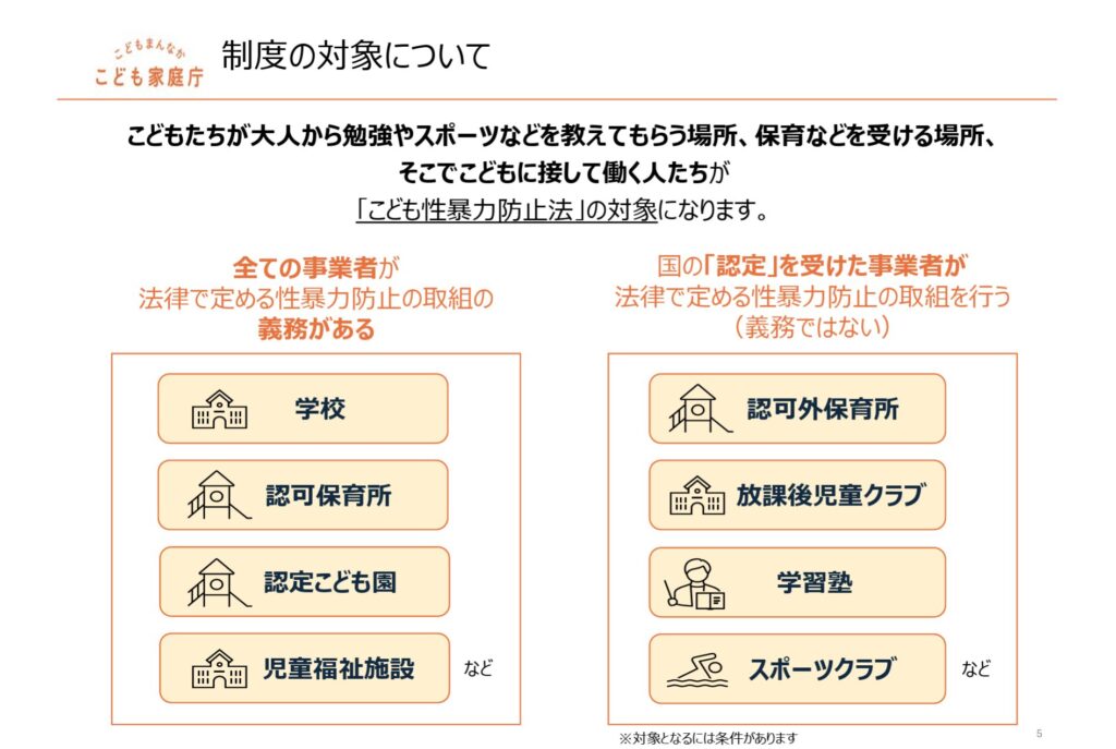 まず、日本版DBS法の中で 「対象事業者」という概念が存在すること自体は法律で確定しています。