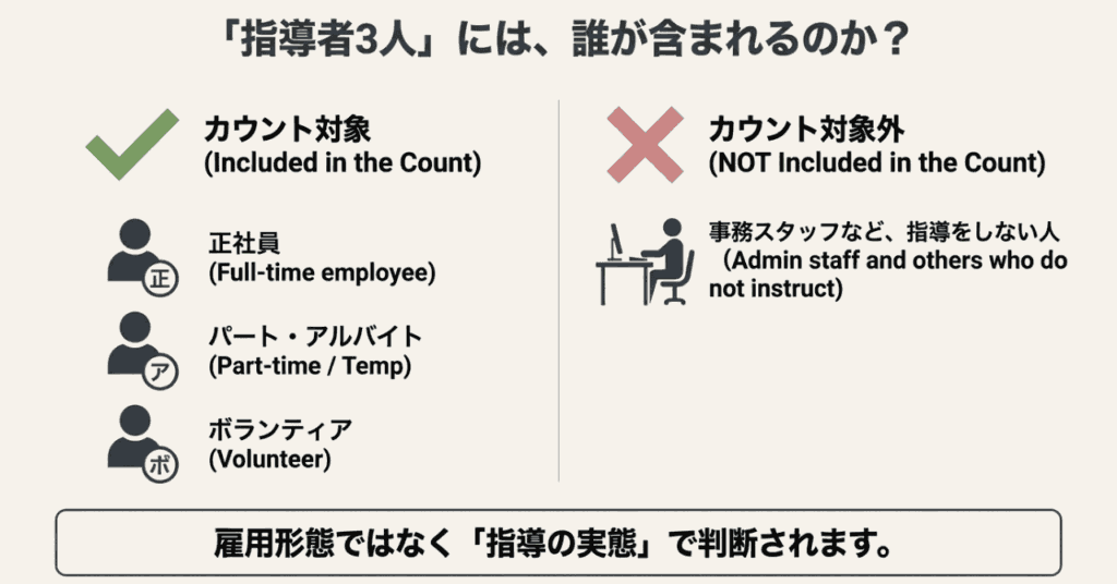 - 人数要件: 指導を行う者の人数が政令で定める人数(3人)以上であること