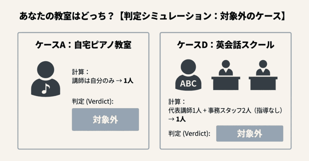 - × 対象外: 先生が一人だけで運営している個人のピアノ教室、英会話教室など