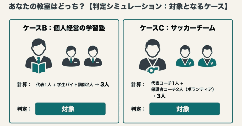 - ケースB:個人経営の学習塾(代表1人 + 学生バイト講師2人)