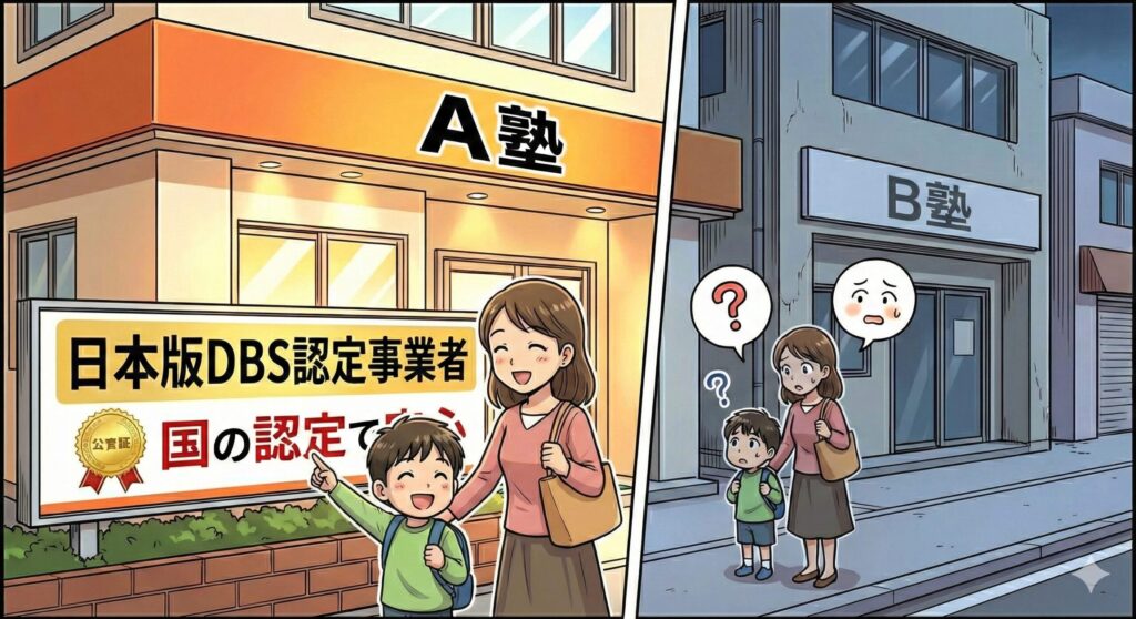 - A塾(スクール): 「当塾は国から『日本版DBS認定事業者』として認められています。講師全員のバックグラウンドチェックを徹底し、お子様を性犯罪リスクから守る体制を構築しています」とHPで宣言している。