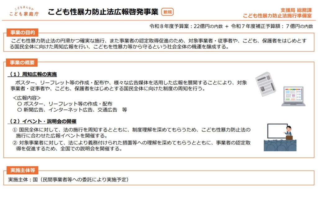 国(こども家庭庁)も今回の制度施行に向け、事業者への周知だけでなく、「こどもや保護者を含む国民全体」に対する広報・啓発に多額の予算を投じて取り組む方針です。